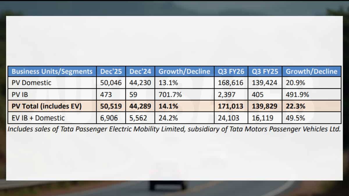 Tata Motors registers total sales of 50,046 passenger vehicles in the domestic market in the last month of 2025, marking an increase of 13.1 per cent over the 44,230 units sold a year ago.