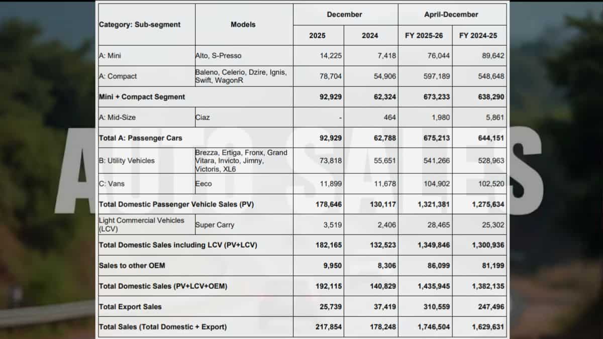 According to Zee Business research, Maruti Suzuki was estimated to register total sales of 2.2 lakh units in the last month of 2025.