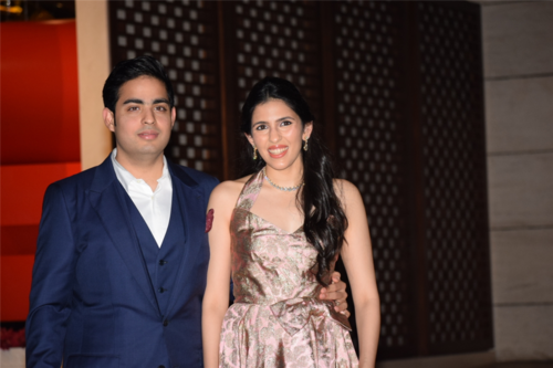Reliance Industries Ltd Chairman Mukesh Ambani's son Akash Ambani and his Bride-to-be Shloka Mehta at a party organised to celebrate their engagement, in Mumbai on March 26, 2018.