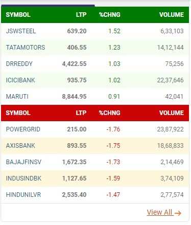 Tech Mahindra, Larsen & Toubro, Maruti Suzuki, JSW Steel and Eicher Motors. The top losers were Britannia Industries Nestle India, Hindustan Unilever, Bajaj Finserv and Kotak Mahindra Bank.