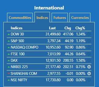 - DOW 30 closed at 31,499.60, up by 417.06 points or 1.34 per cent on Monday.