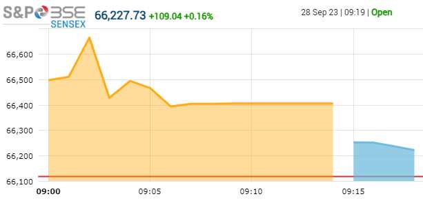 Sensex gains over 100 points, at 66,228 in opening deals.
