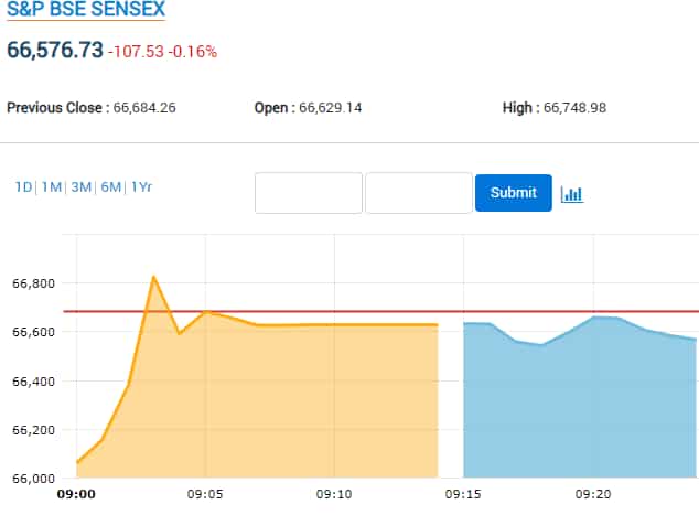 Sensex slips over 100 points to trade at 66,576,73 in opening deals.