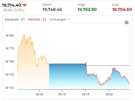Nifty trades at 19,714,4 down by 0.15 per cent in opening deals.