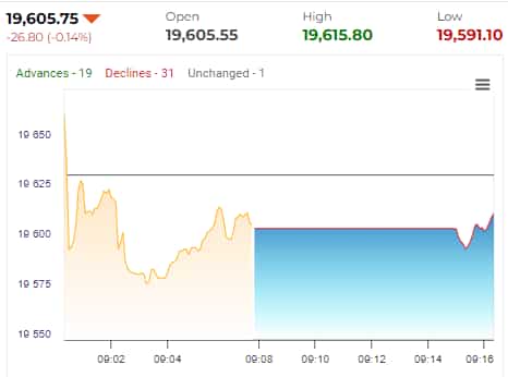 Nifty slips 26.8 points in opening deals to trade at 19,605.75.