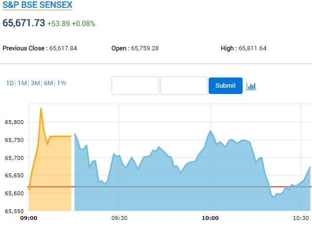 S&P BSE Sensex is up over 100 pts to trade at 65,771 in early morning deals.