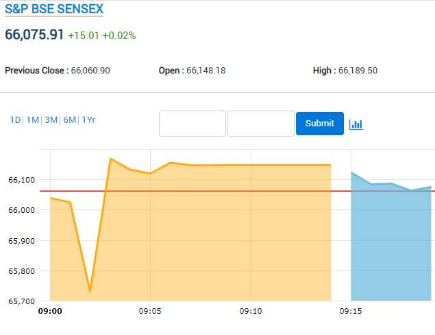 S&P BSE Sensex trades at 66,075.91 up 15 points, or 0.02 per cent in opening deals.