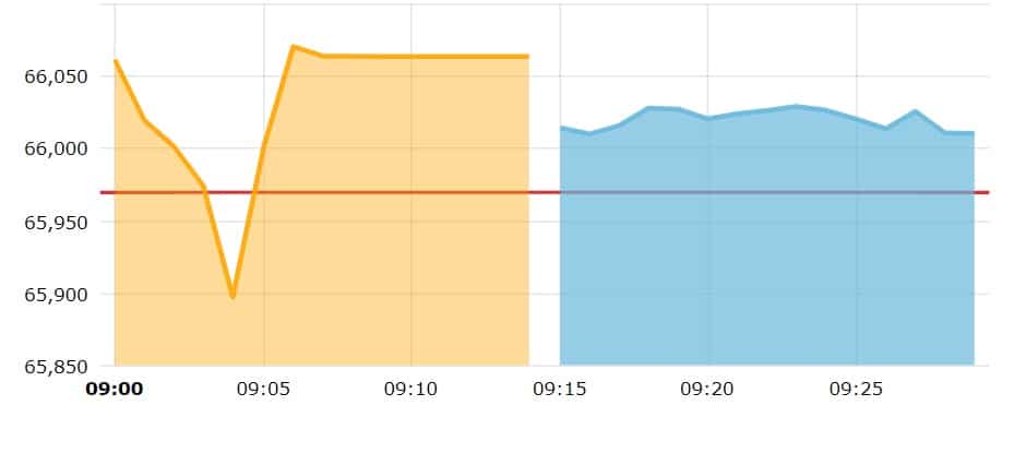 The Sensex is up 93.7 pts, or 0.1 per cent, at 66,063.7 at the end of the pre-opening session.