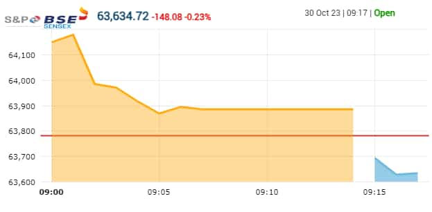 Sensex trades nearly 150 points lower at 63,635 in opening deals.