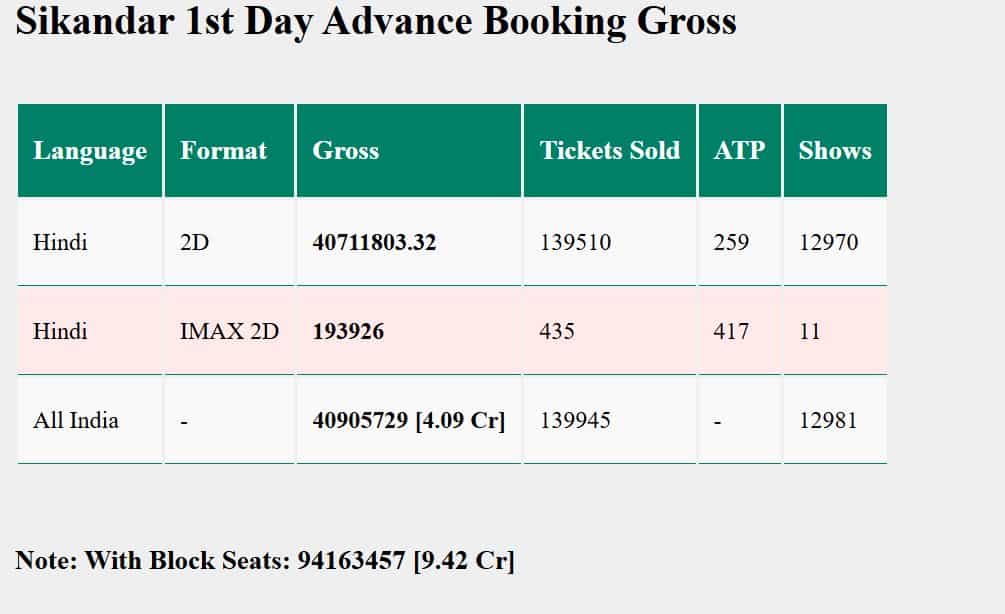 According to Sacnilk, Sikandar's advance ticket sales have generated buzz, with over 1,39,945 tickets sold all over India on the first day of advance booking, earning Rs 9.42 crore (note: with block seats). Most sales come from 2D formats. Maharashtra and Delhi are the top markets, with Delhi at 1.51 crore and Maharashtra at Rs 1.21 crore (in 2d first day advance booking reports).